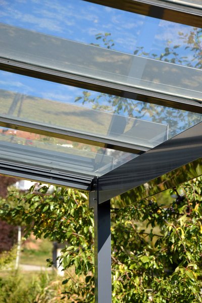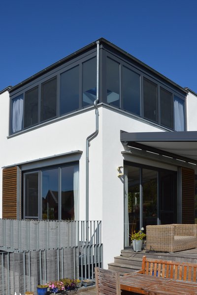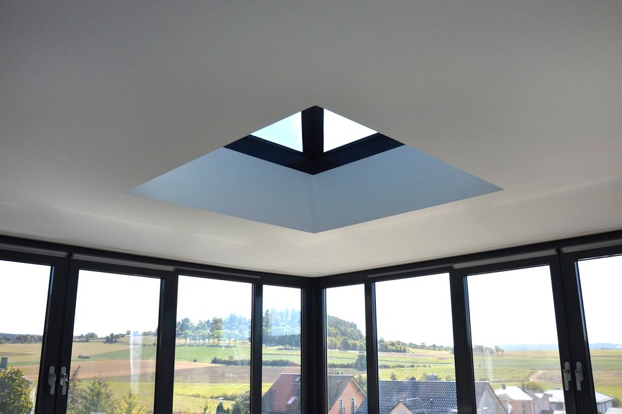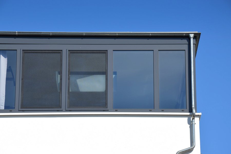 Dieser Aluminium-Wintergarten von WIKOMA vergrößert den Wohnraum im ersten Stock. Die Terrasse bietet zusätzlichen Platz zum Entspannen und Sonnenbaden. Das Flachdach mit dem Pyramidenfenster schützt vor zu viel Sonneneinstrahlung. Die Schiebe-Fenster stehen auf der vorhandenen Brüstungsmauer.