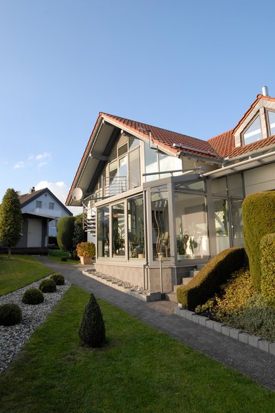 Dieser Aluminium-Wintergarten mit Pultdach schmiegt sich mit der beidseitig schrägen Grundfläche unauffällig an das Haus an. Die außenliegende Wintergartenmarkise lässt sich bequem von innen steuern und beschattet zuverlässig den gesamten Wintergarten.