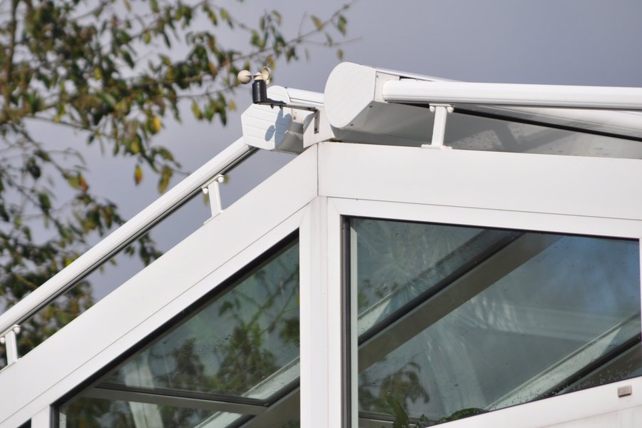 Die beidseitige Wintergartenmarkise ist mit einem Windsensor verbunden, so dass sie bei zu starkem Wind automatisch eingerollt wird.