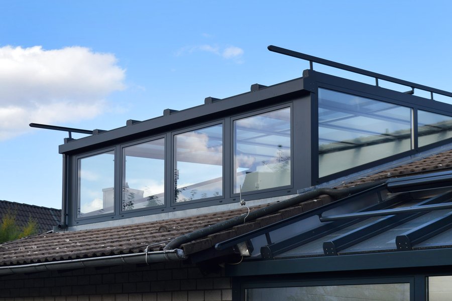 Eine Dachgaube mit Wintergartenmarkise im Obergeschoss schafft einen zusätzlichen Wohnraum mit voller Stehhöhe.