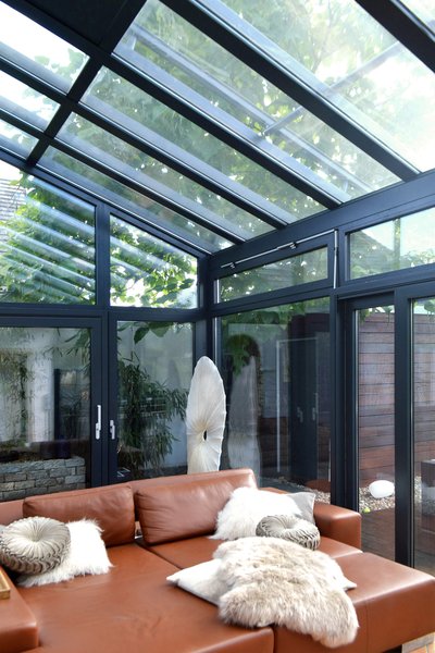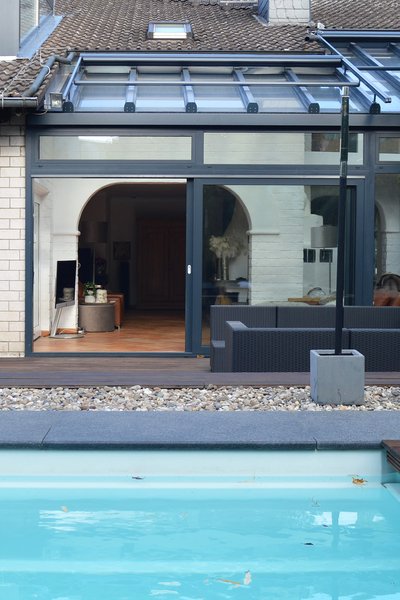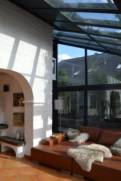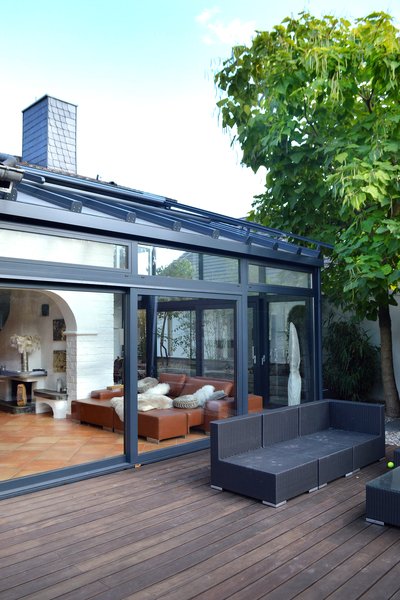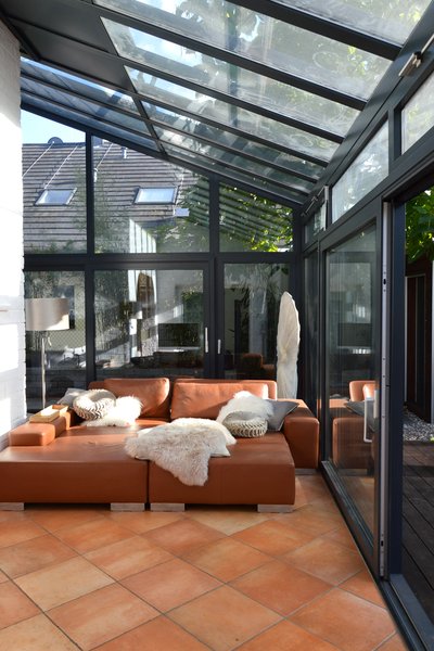 Das Pultdach dieses Aluminium-Wintergartens schließt nahtlos an das Hausdach an. Mit dem Wärmeschutzglas und dem Kachelofen muss man sich auch im Winter kein dickes Fell zulegen.