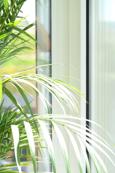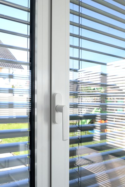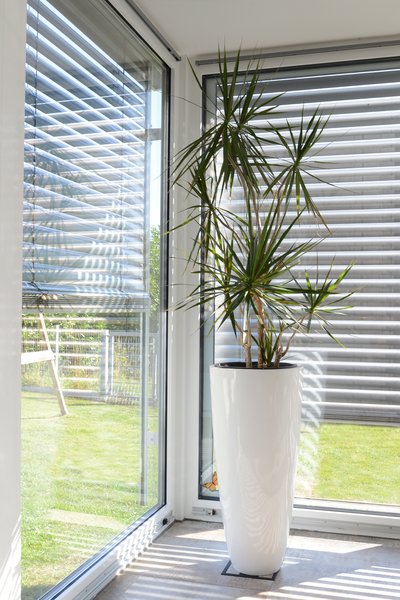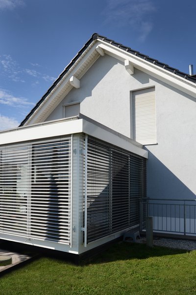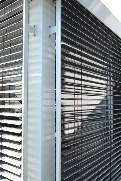- Aluminiumkonstruktion mit visuell dominanten Außenjalousien