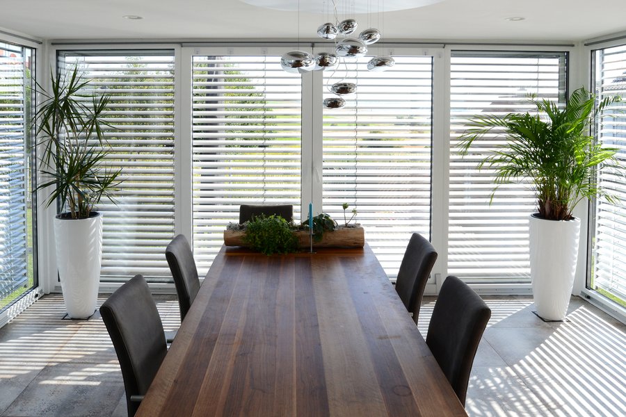 WIKOMA-Wintergarten mit aussenliegendem Beschattungssystem an allen drei Seiten.