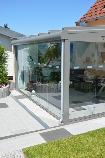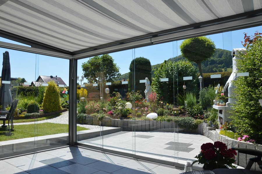 Dieser Sommergarten bietet im Sommer Schutz vor Regen, Wind, Sonne und Insekten. Die hier verbauten rahmenlosen Ganzglas-Schiebeelemente lassen sich platzsparend zur Seite schieben und machen aus dem Sommergarten eine luftige Terrassen-Überdachung.