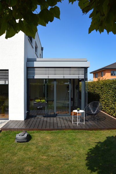 Nahtlos fügt sich dieser WIKOMA-Wintergarten aus Aluminium in die Gestaltung der Außenfassade ein. Besonders die visuell dominanten Außenjalousien und der exakt gleiche Farbton der Pulverbeschichtung sowohl am Gebäude als auch am Wintergarten tragen zum harmonischen Gesamtergebnis bei.