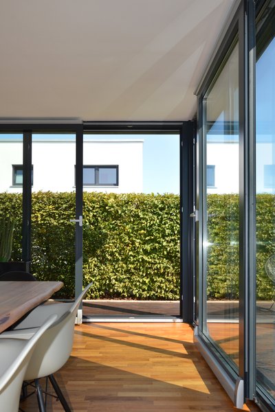 Die geschlossene Decke im Innenraum sorgt für einen nahtlosen Übergang zwischen Wintergarten und Wohnbereich. Dieses architektonische Detail verstärkt das Gefühl von Kontinuität und Ganzheitlichkeit.