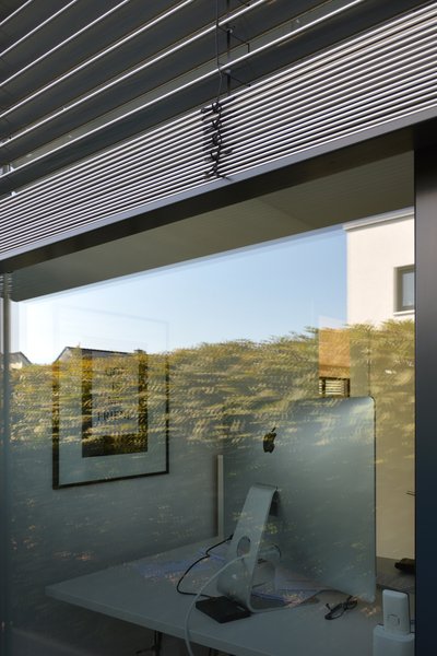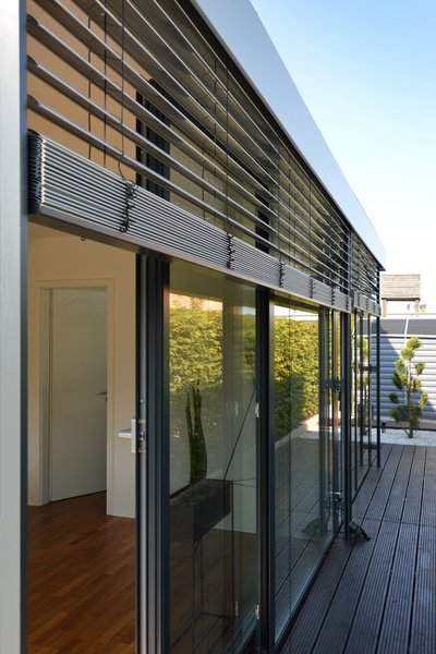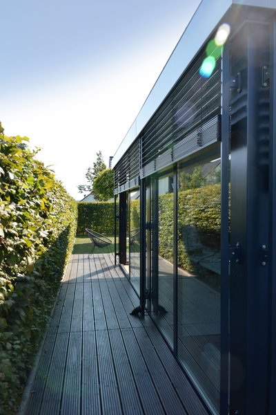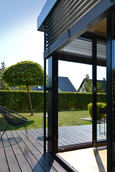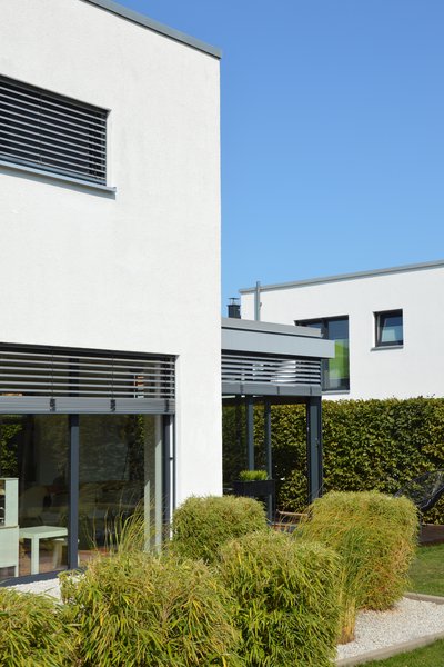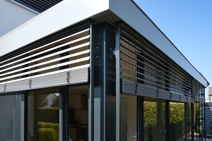 - Aluminiumkonstruktion mit visuell dominanten Außenjalousien