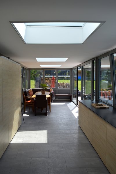 Der langgezogene Flachdach-Wintergarten ist mit drei aufeinanderfolgenden Oberlichtern bestückt.