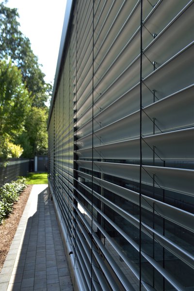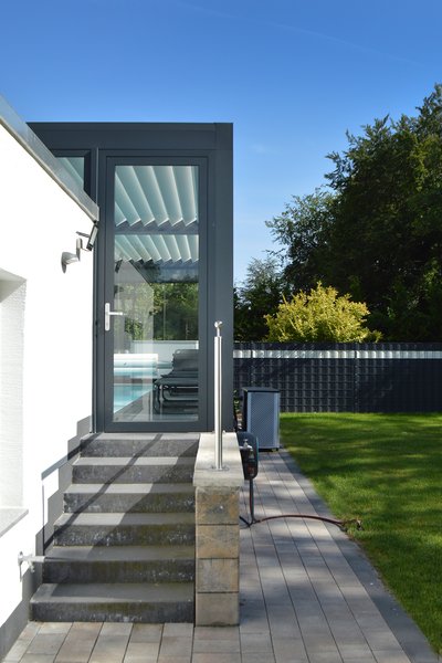 Vorgelagert wurde zudem eine große Poolüberdachung mit Lamellendach und Elementen zum schließen. Das Lamellendach schützt nicht nur vor starker Sonneneinstrahlung sondern sorgt auch für reizvole Licht- und Schattenspiele.