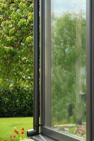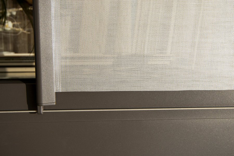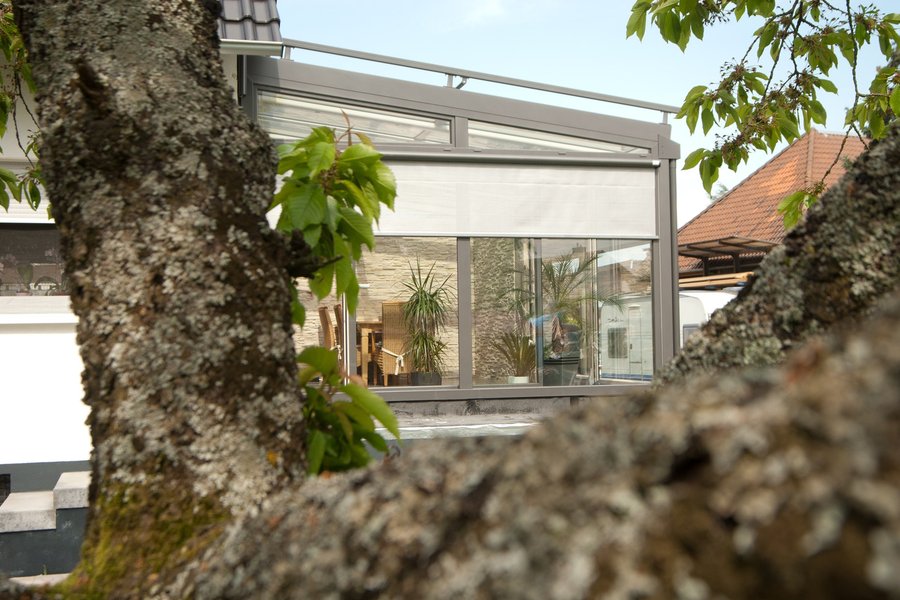 Die Wintergartenmarkise und die Senkrechtbeschattung an der Außenseite ermöglichen eine präzise Dosierung des Lichts. Dies erlaubt den Bewohnern, die Helligkeit im Wintergarten nach ihren individuellen Vorlieben anzupassen.