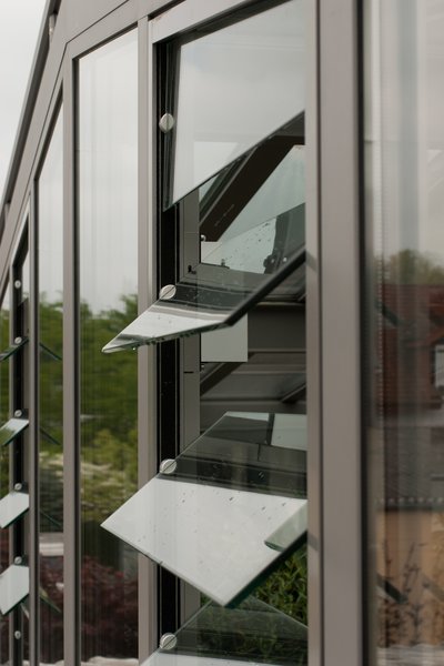 - Stufenlose Luftzirkulation mit Lamellenfenstern und Hebe-Schiebe-Fenstern
